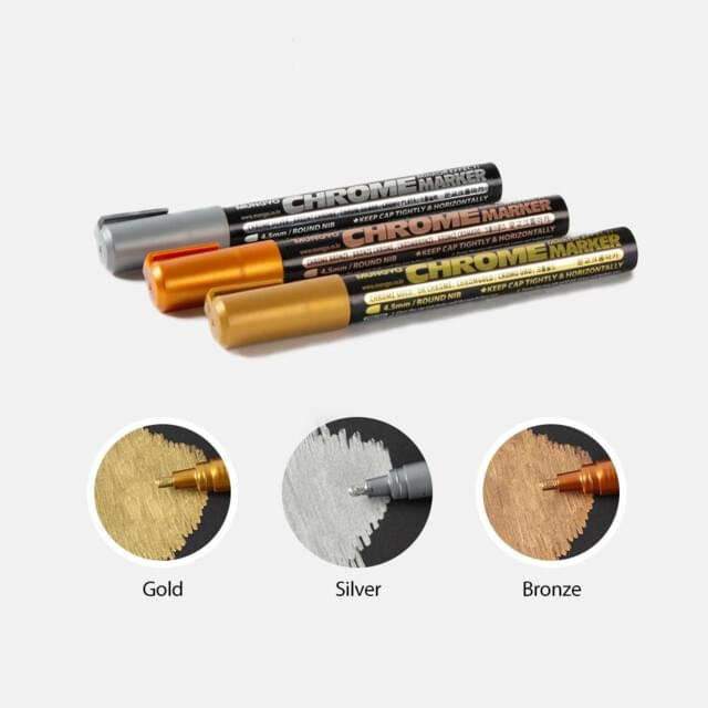 MUNGYO METALLIC CHROME MARKER SET OF 3. The 4.5mm wide bullet tip produces lines 2-3mm wide and once dry the ink becomes permanent and waterproof. Hang-sell set includes one pen each in bronze, gold and silver. |