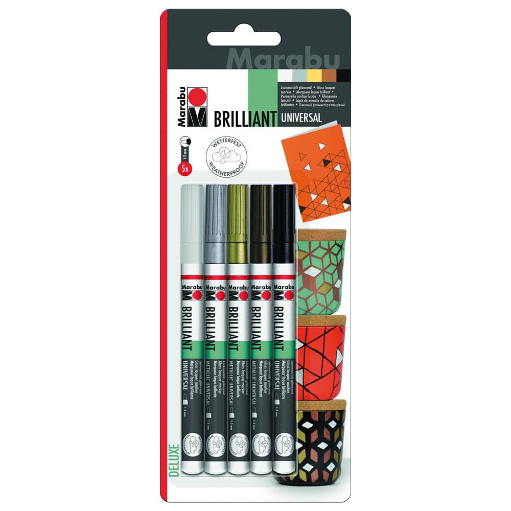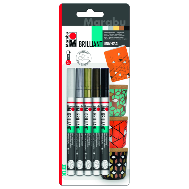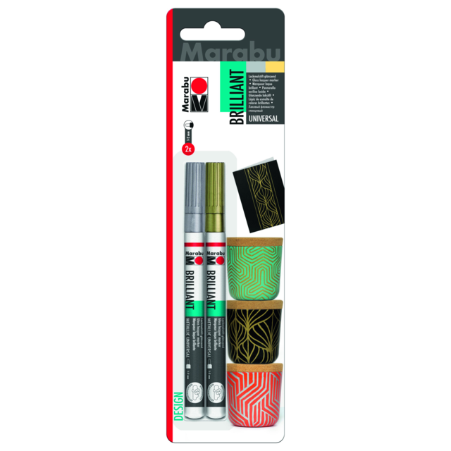 Marabu Brilliant Painters are the perfect paint marker for use on rubber, metallic and leather as well as paper and cardboard. Organic solvent based, containing no toluene or xylene. They are weatherproof, light-resistant and fast drying to a brilliant gloss finish. Set contains one Brilliant Painter each in silver and gold.