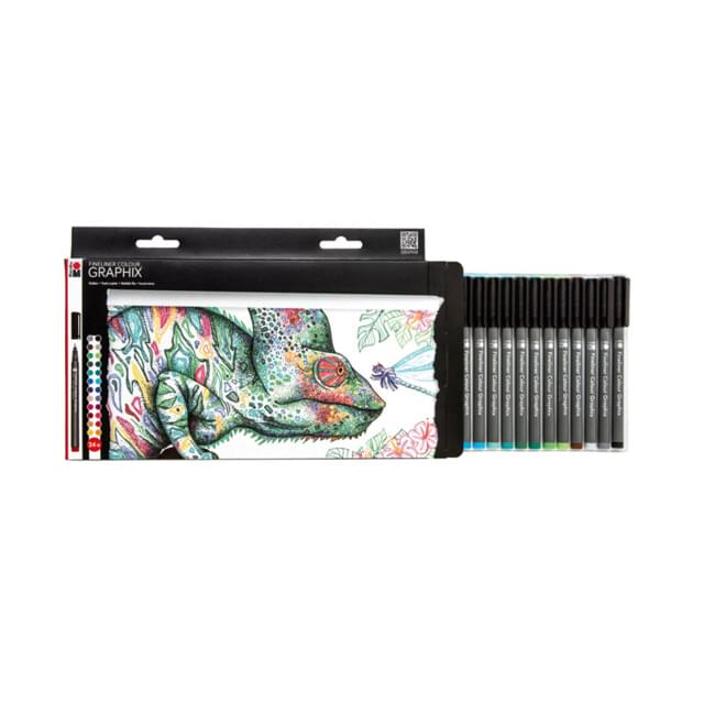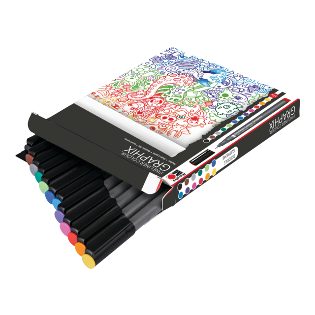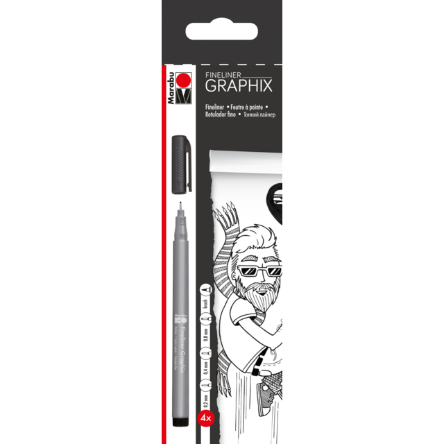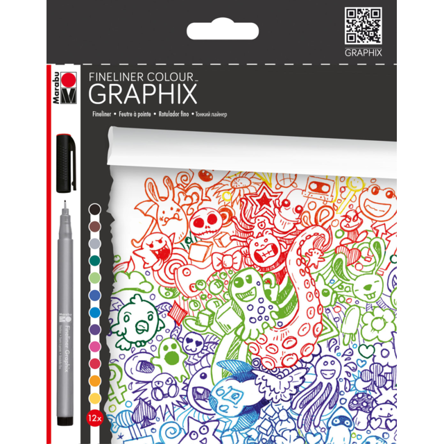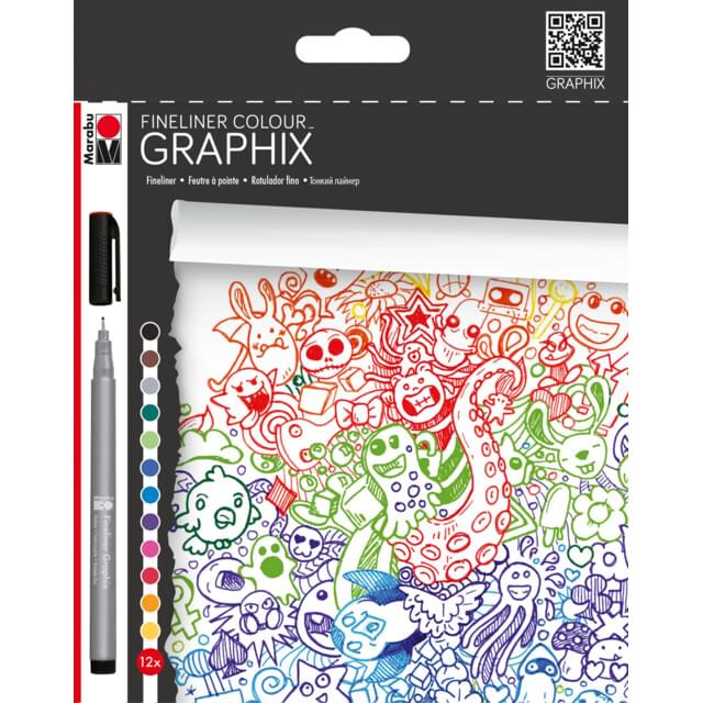 MARABU GRAPHIX FINELINER SET OF 12 COLOURS. Contains one Marabu Graphix 0.5mm fineliner each in ruby red, dark ultramarine, dark green, yellow, orange, pink, plum, azure blue, yellow green, grey, dark brown and black. |