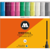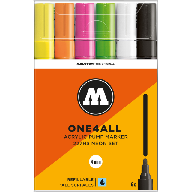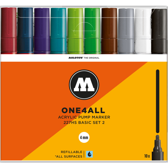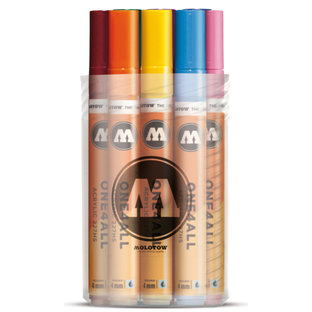 MOLOTOW 4mm ONE4ALL ACRYLIC MARKER MAIN KIT 1. Contains one 4mm tip marker each in zinc yellow, dare orange, traffic red, burgundy red, shock blue middle, true blue, currant, neon pink, mister green, hazelnut brown, signal white and signal black. Packed in an attractive, clear polypropylene-box. |