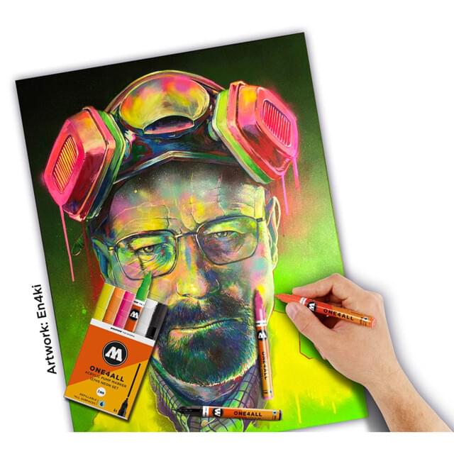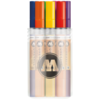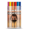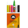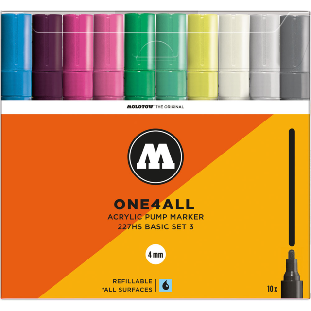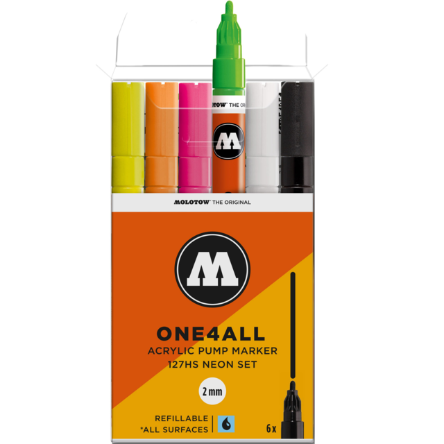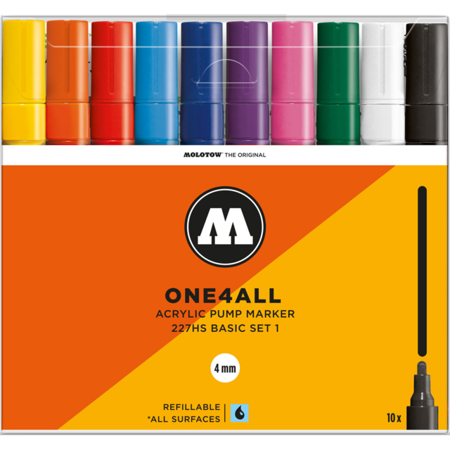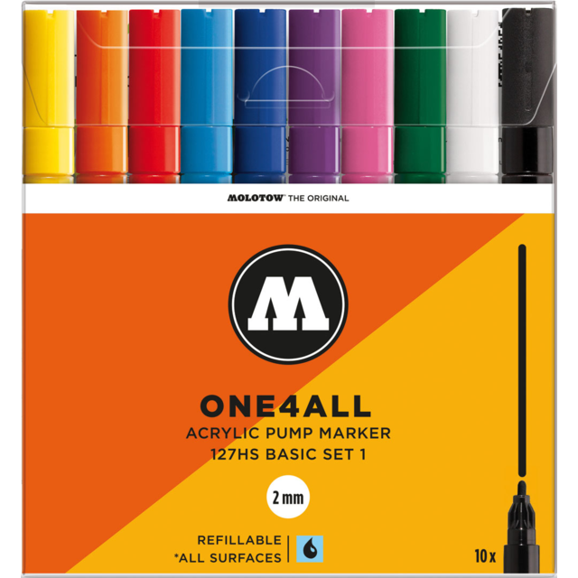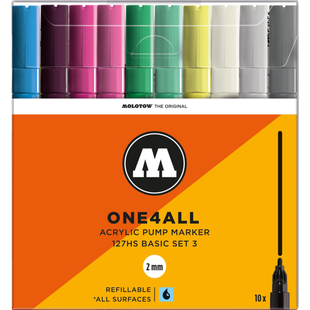 MOLOTOW 2mm ONE4ALL ACRYLIC MARKERS BASIC SET 1. Contains one 2mm tip marker each in zinc yellow, dare orange, traffic red, shock blue middle, true blue, currant, neon pink, Mister green, signal white and signal black. Packed in a clear, resealable box. |