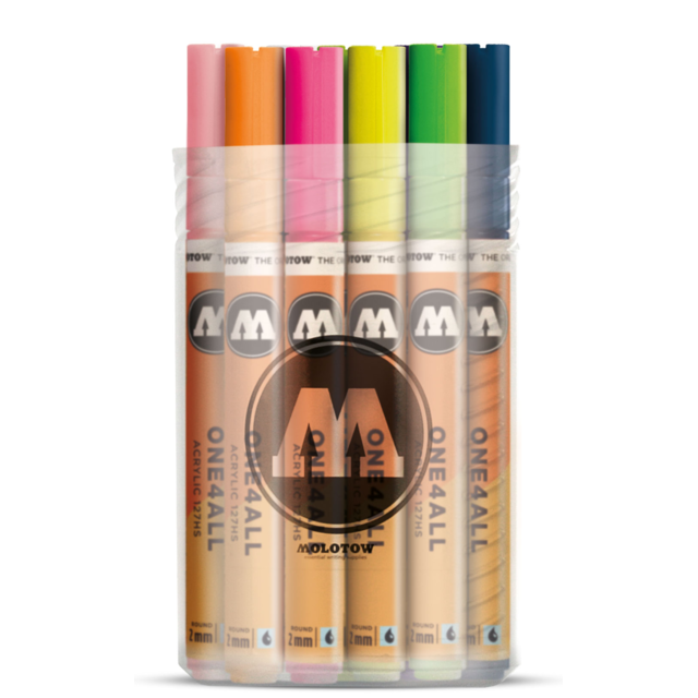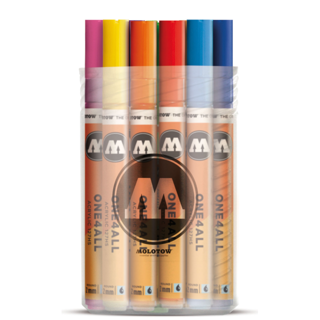 MOLOTOW 2mm ONE4ALL ACRYLIC MARKER FLESH COLOURS (CHARACTER) SET. Contains one 2mm tip marker each in hazelnut brown, lobster, ochre brown light, Sahara beige pastel, peach pastel and powder pastel. Packed in a clear, resealable box. |