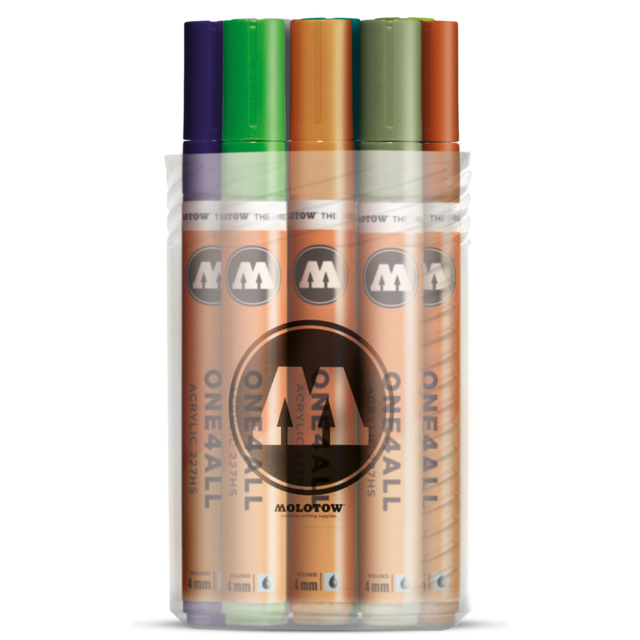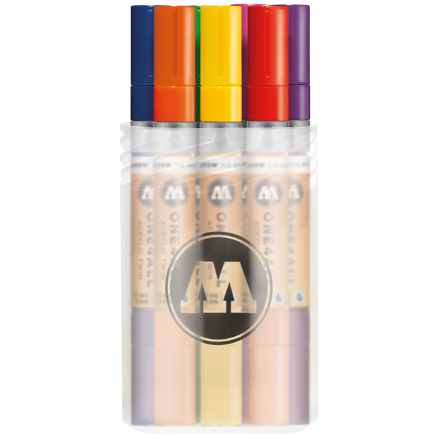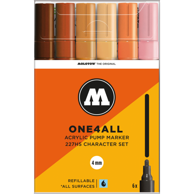 *MOLOTOW 4mm ONE4ALL ACRYLIC MARKER FLESH COLOURS (CHARACTER) SET. Contains one 4mm tip marker each in hazelnut brown, lobster, ochre brown light, Sahara beige pastel, peach pastel and powder pastel. Packed in a clear, resealable box. |