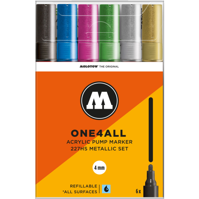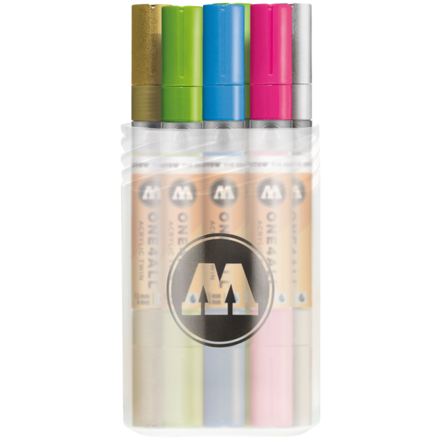*MOLOTOW 4mm ONE4ALL ACRYLIC MARKER METALLIC SET. Contains one 4mm tip marker each in metallic black, metallic blue, metallic pink, metallic light green, metallic silver and metallic gold. Packed in a clear, resealable box. |