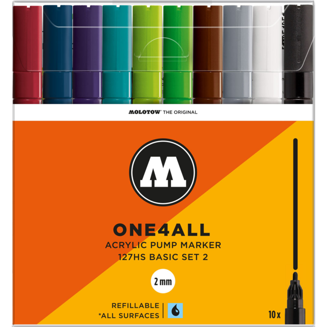 MOLOTOW 2mm ONE4ALL ACRYLIC MARKER BASIC SET 2. Contains one 2mm tip marker each in burgundy, petrol, violet dark, lagoon blue, grasshopper, cacao green, hazelnut brown, cool grey pastel, signal white and signal black. Packed in a clear, resealable box. |