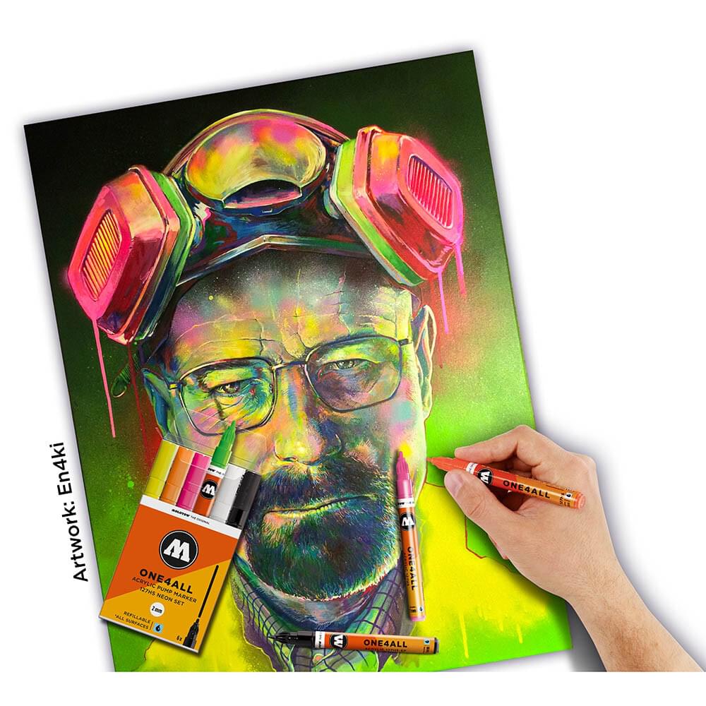 MOLOTOW 4mm ONE4ALL ACRYLIC MARKER MAIN KIT 2. Contains one 4mm tip marker each in petrol, violet dark, lagoon blue, grasshopper, cacao universes green, future green, Amazonas light, lobster, ochre brown light, signal white and 2 each signal black. Packed in an attractive, clear polypropylene-box. |