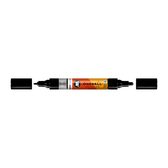 MOLOTOW ONE4ALL TWIN ACRYLIC MARKER 1.5mm/4mm MAIN KIT 1 Double-ended markers with a 1.5mm tip on one end and 4mm tip on the other. Contains one marker each in zinc yellow, traffic red, dare orange, true blue, currant, signal white, signal black, cacao green, shock blue, magenta, poison green and grey blue light. Packed in a clear polypropylene screw box. |
