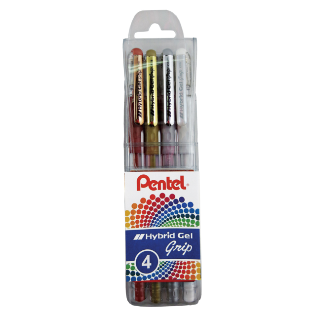 PENTEL HYBRID GEL GRIP METALLIC ROLLER PENS 0.8mm WALLET SET OF 4. One pen each in Bronze, Gold, Silver and White. |