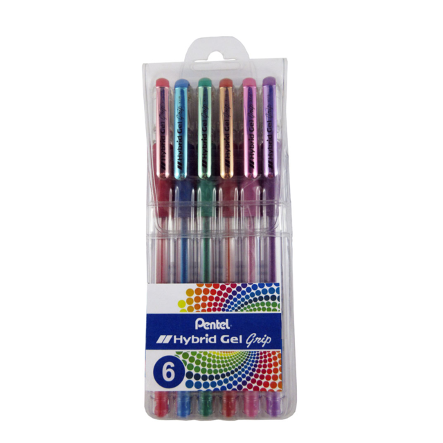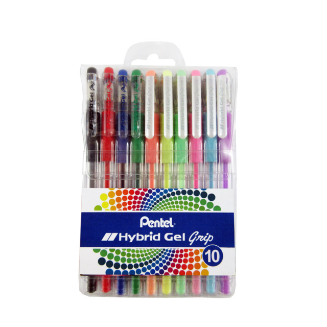 PENTEL HYBRID GEL GRIP ROLLER PEN SET 10 ASSORTED. A combination of 0.6mm and 0.8mm Hybrid Gel pens in standard and pastel colours. Includes standard 0.6mm colours of black, red, blue and green plus 0.8mm pastel colours of light green, pink, sky blue, yellow and violet. The pastel colours are ideal for writing on both light and dark paper.