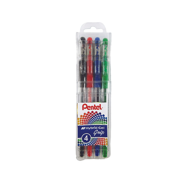 PENTEL HYBRID GEL GRIP ROLLER PEN BASIC SET 4 ASSORTED. Set comprises one pen 0.6mm Hybrid Gel pens in basic of colours black, red, blue and green. Features sculpted rubber finger grip for optimum control, crystal-style transparent barrel for easy view of remaining ink level and revolutionary pigment gel ink waterproof and fade-resistant. |