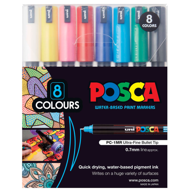 UNIBALL POSCA FIBRE TIP PAINT MARKER 0.7mm ASSORTED SET OF 8 COLOURS. One each of white, yellow, pink, red, blue, light blue, green and black. |