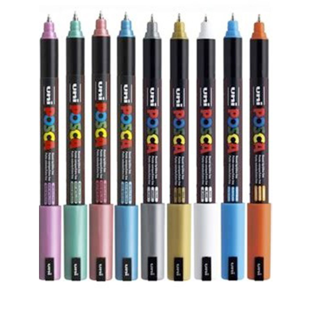 UNIBALL POSCA FIBRE TIP PAINT MARKER 0.7mm - METALLIC SET OF 12. Contains 1 x metallic red, 1 x metallic green, 2 x metallic pink, 2 x metallic blue, 3 x gold and 3 x silver. |