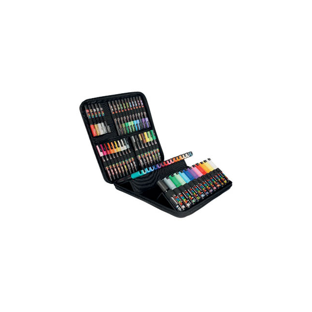 UNIBALL POSCA STORAGE CASE LARGE with carry handle. Zip up hard shell case is compact and offers two separate compartments to hold up to 60 Posca Markers, kept secure and neat with thick elastic. Compartments can be split and raised for easy pen selection. Case size is 350x350x60mm |