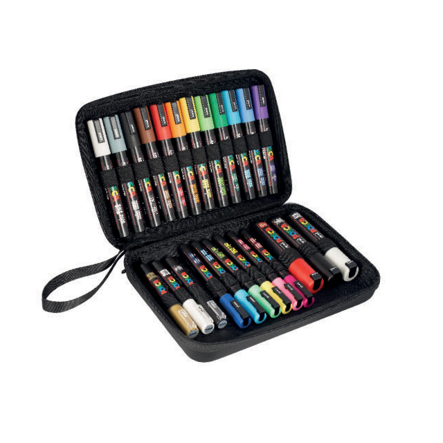 UNIBALL POSCA STORAGE CASE SMALL. Holds up to 25 MARKERS. The zip-up, hard shell case is compact and offers two separate compartments to hold up to 25 Posca Markers, kept secure and neat with thick elastic. Case size is 275x190x60mm |