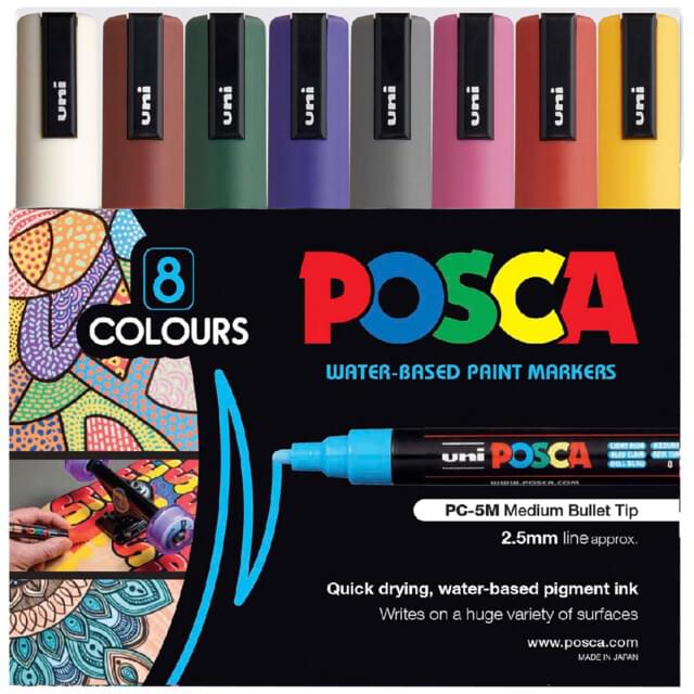 Uniball Posca are the ultimate paint markers allowing you to paint with the convenience of a marker! Each marker is filled with an opaque, water-based acrylic paint that is non-toxic, fast drying, lightfast and acid-free. These markers will bond permanently and waterproof to porous surfaces such as paper, board, fabric, timber, clay, plaster and most other porous materials. They are removable from non-porous, sealed surfaces such as glass, metal and plastic.