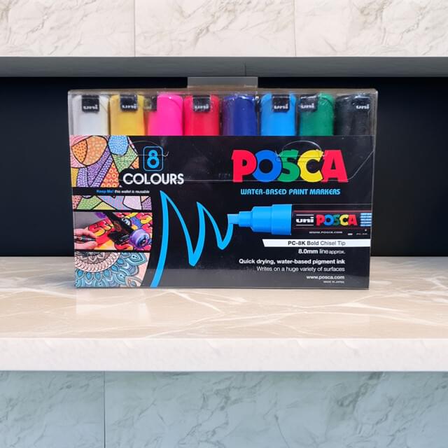 UPO8AS08 UPO8AS08 UNIBALL POSCA CHISEL TIP PAINT MARKER 8mm BASIC 8 COLOUR SET. Posca markers are the ideal tool for bright, striking results in your artwork. Suited to illustration, drawing, pop-art, as well as fashion, interior and graphic design. Supplied with an 8mm stroke chisel tip nib which is great for both blocking in colour and line work. Suitable for most surfaces including paper, cardboard, canvas, wood, terracotta, papier mache, air dry clay including some metal and plastic surfaces. This 8 piece pack is perfect as a starter pack and contains a marker pen each of white, pink, yellow, green, blue, light blue, red and black, In stock Login For Price