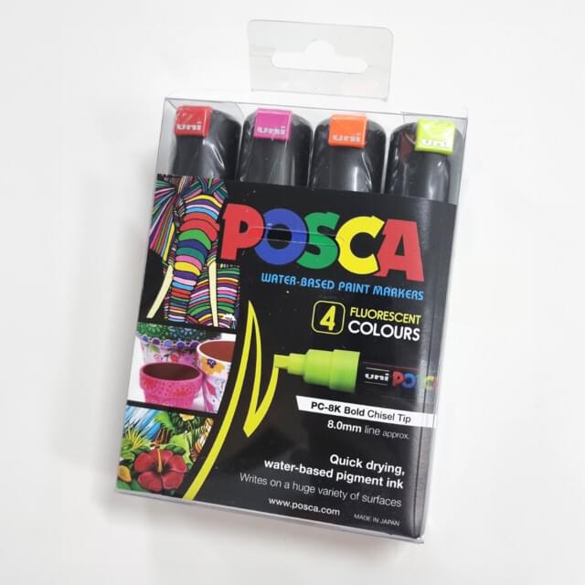 UPO8FL04 UPO8FL04 UNIBALL POSCA CHISEL TIP PAINT FLUORESCENT MARKER 8mm 4 COLOUR SET. Posca markers are the ideal tool for bright, striking results in your artwork. Suited to illustration, drawing, pop-art, as well as fashion, interior and graphic design. Supplied with an 8mm stroke chisel tip nib which is great for both blocking in colour and line work. Suitable for most surfaces including paper, cardboard, canvas, wood, terracotta, papier mache, air dry clay including some metal and plastic surfaces. This 4 piece pack is perfect as a starter pack and contains one pen each of orange,blue, pink, yellow and red. Available soon Login For Price