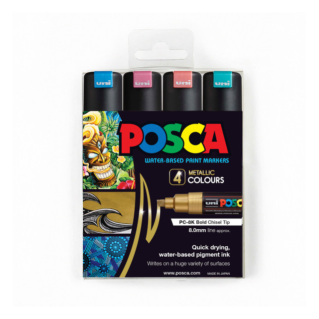 UPO8ME04 UPO8ME04 UNIBALL POSCA CHISEL TIP PAINT METALLIC MARKER 8mm 4 COLOUR SET. Posca markers are the ideal tool for bright, striking results in your artwork. Suited to illustration, drawing, pop-art, as well as fashion, interior and graphic design. Supplied with an 8mm stroke chisel tip nib which is great for both blocking in colour and line work. Suitable for most surfaces including paper, cardboard, canvas, wood, terracotta, papier mache, air dry clay including some metal and plastic surfaces. This 4 piece pack is perfect as a starter pack and contains one pen each of metallic blue, green, pink and red. In stock Login For Price