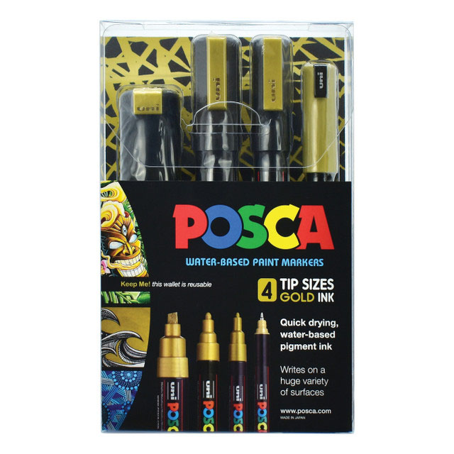 UNIBALL POSCA GOLD 3 BULLET+CHISEL MARKER 4 SIZE WALLET SET. Contains one gold felt tip paint maker in each of bullet tip styles Ultra-fine 0.7mm, Fine 1.3mm, Medium 2.5mm plus a chisel tip Broad 8.0mm wide. |