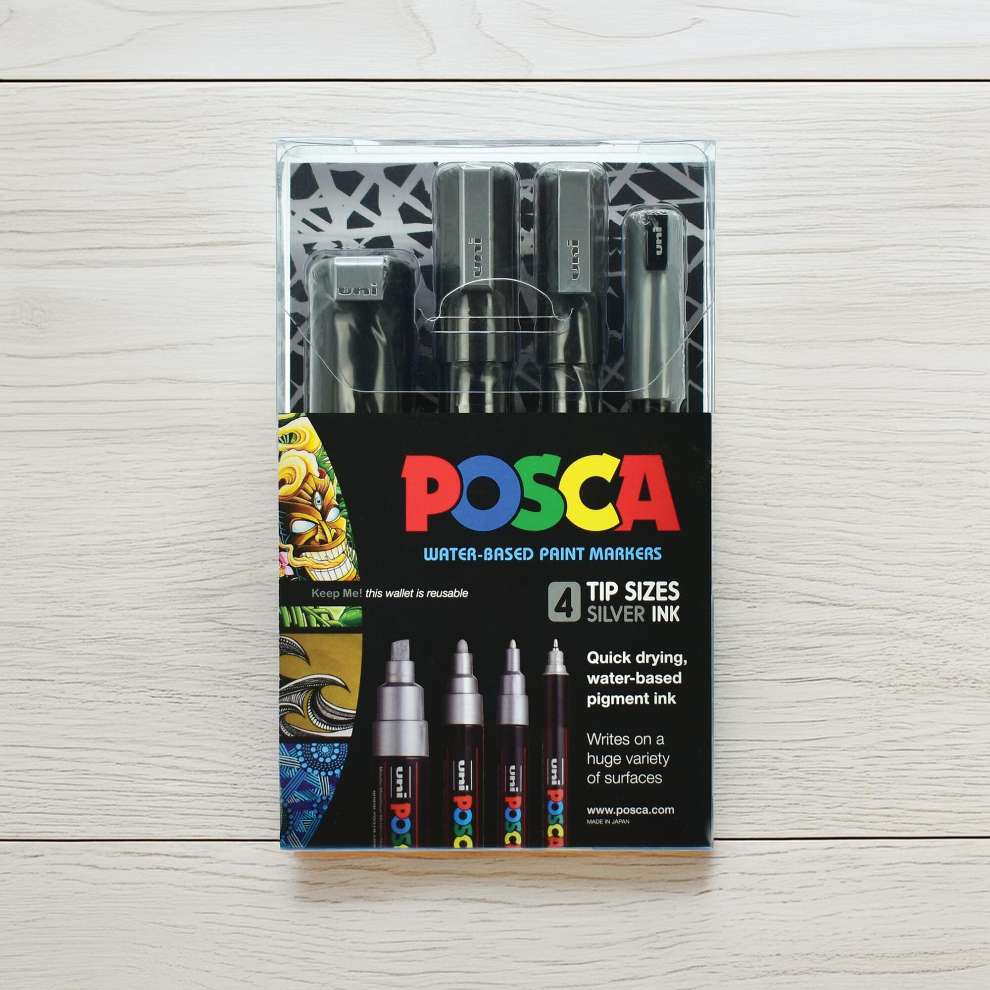 UNIBALL POSCA SILVER 3 BULLET+CHISEL MARKER 4 SIZE WALLET SET. Contains one silver felt tip paint maker in each of bullet tip styles Ultra-fine 0.7mm, Fine 1.3mm, Medium 2.5mm plus a chisel tip Broad 8.0mm wide. |