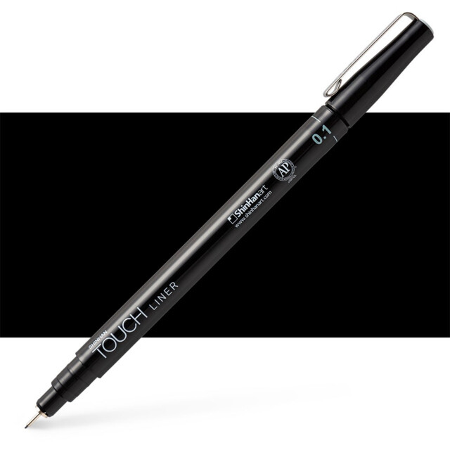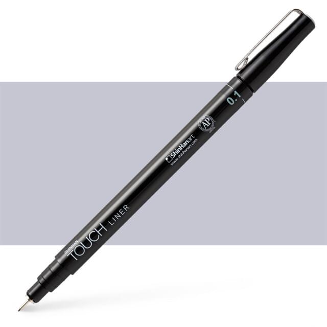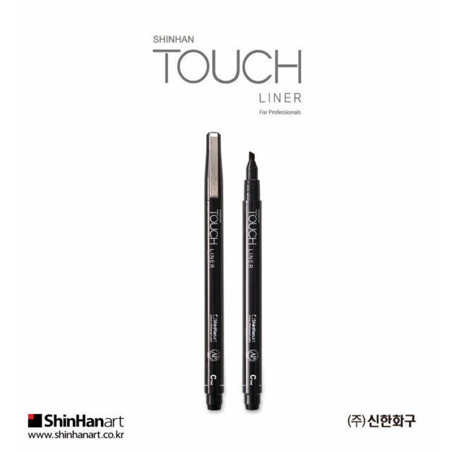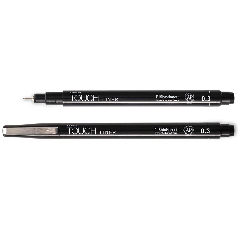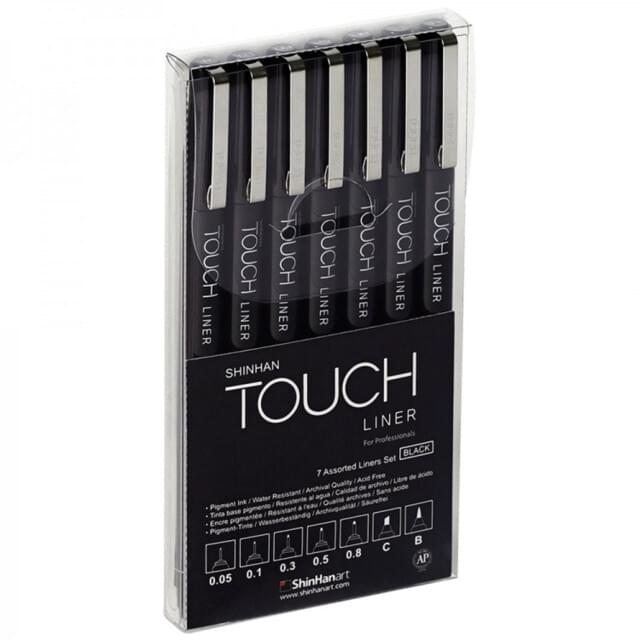 SHINHAN TOUCH FINELINERS BLACK 7 ASSORTED SIZE SET. Contains 1 each pen of 0.05, 0.1, 0.3, 0.5, 0.8mm, chisel and brush. |