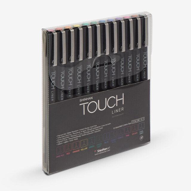 SHINHAN TOUCH FINELINERS 0.1mm 12 ASSORTED COLOUR SET. One pen each in black, blue, green, orange, purple, red, brown, wine red, deep green, cobalt blue, pink and yellow. |