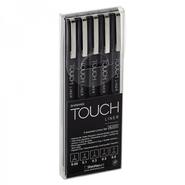 SHINHAN TOUCH FINELINERS BLACK 5 ASSORTED SIZE SET. Contains 1 each pen of 0.05, 0.1, 0.3, 0.5 and 0.8mm |