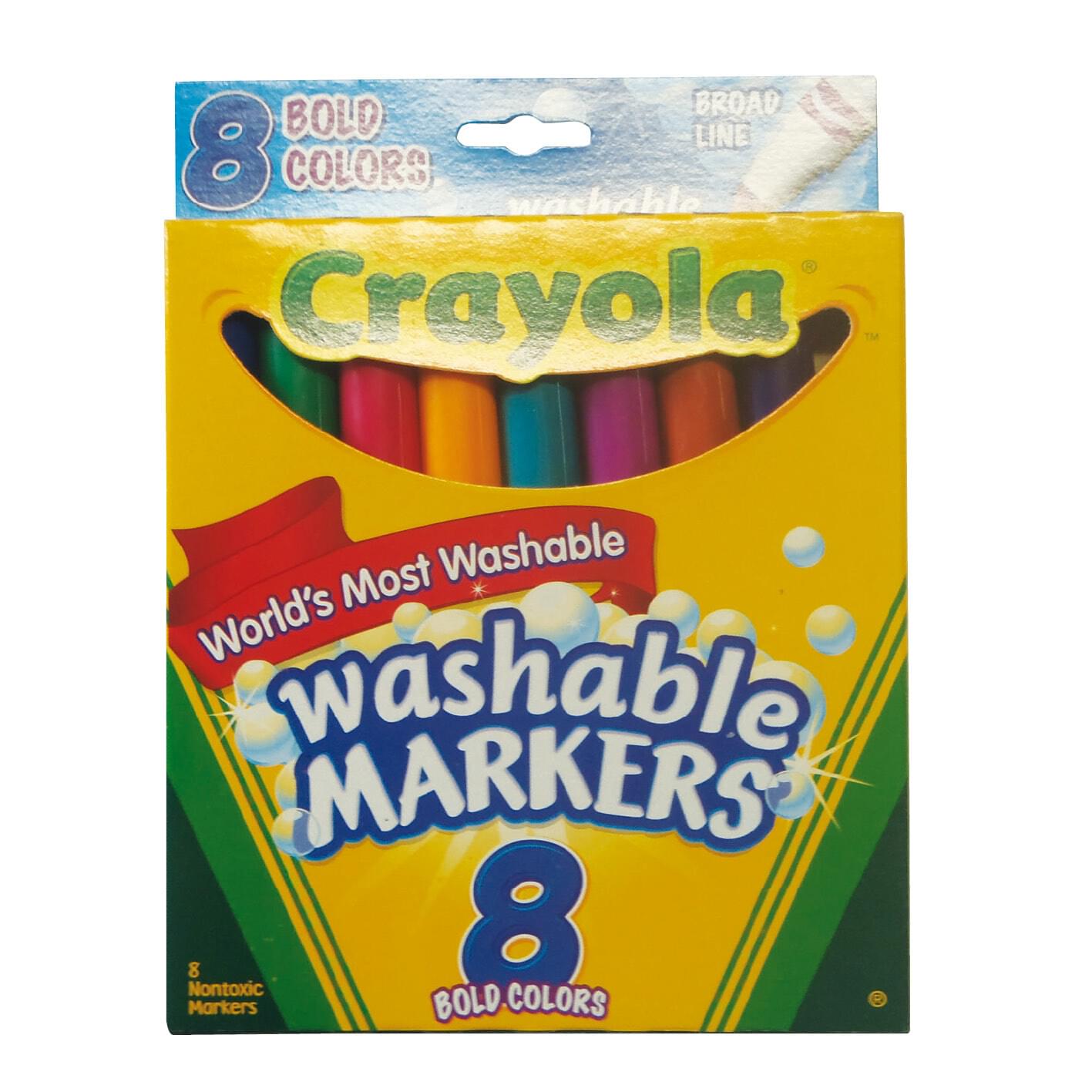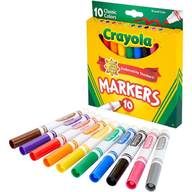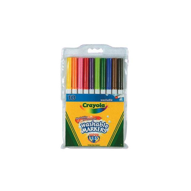 CRAYOLA WASHABLE ULTRA-CLEAN BROADLINE BRIGHT COLOUR MARKERS- 10 ASSORTED COLOURS. Ultra-Clean Washable Broad Line Markers are specially formulated with ColorMax technology to have the brightest, vivid colours. The Markers feature a versatile tip that draws both thick or thin lines, are longer-lasting and wont dry out as the tip can be rejuvenated by dipping in water. |