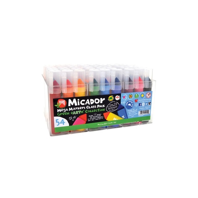 *MICADOR MEGA MARKERS CLASSPACK 54 ASSORTED. Micador Mega Markers are the enviromentally friendly marker with chunky barrel that suits a child s full handed grip. Cone shaped nib for wide and fine line. Dry markers can be re-hydrated by dipping the nib in water. Safe for young uses and non-toxic. |