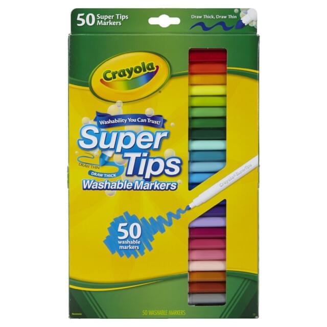 CRAYOLA SUPERTIP MARKER 50 ASSORTED COLOURS SET. 50 different and vibrant classic colours that will not bleed through paper. If caps are left off, the fibre tip can be rejuvenated by dipping in room temperature water for 30 seconds. |