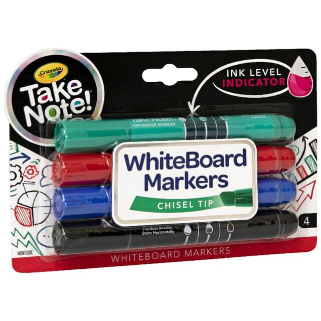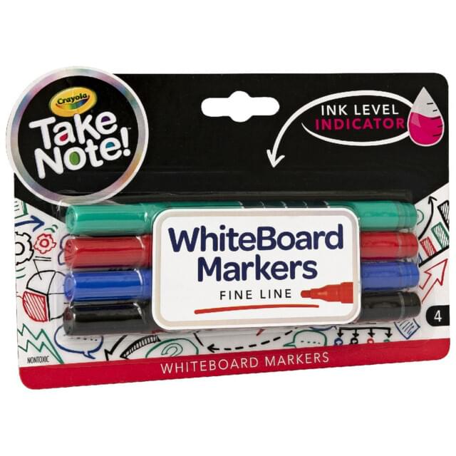 CRAYOLA TAKE-NOTE BULLET TIP PREMIUM WHITEBOARD MARKERS PACK 4. Dry erase bullet tip markers with low odour Advanced Premium ink that stands out on the whiteboard surface and wipes off easily. One marker each in Red, Green, Blue and Black. Xylene free. |