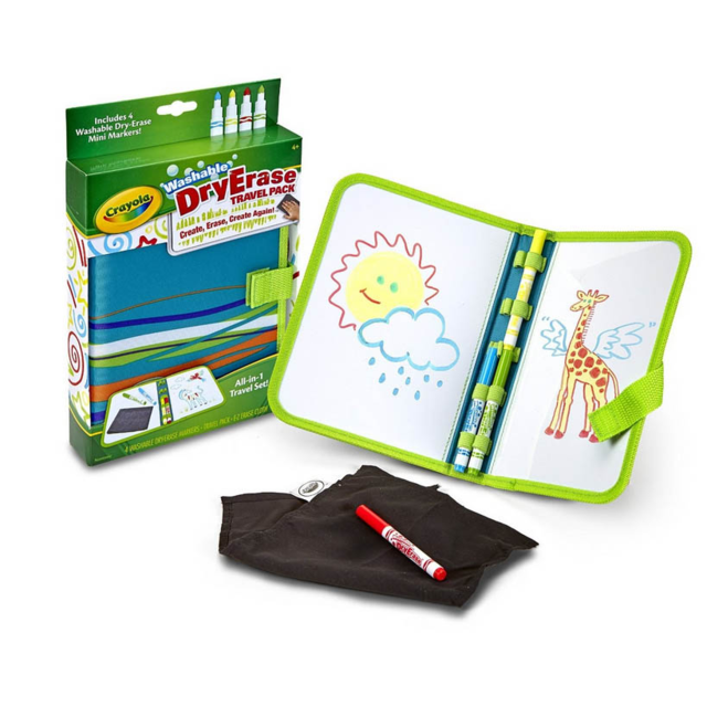 CRAYOLA TAKE-NOTE CHISEL TIP DRY ERASE WHITEBOARD TRAVEL SET - ART ON THE GO! Create, erase & create again, on the go or anywhere with the Crayola Dry-Erase Travel Pack. It features two reusable drawing surfaces that fold up into one portable pack. Comes equipped with 4 low-odour, washable dry-erase mini markers and an E-Z dry-erase cleaning cloth. |
