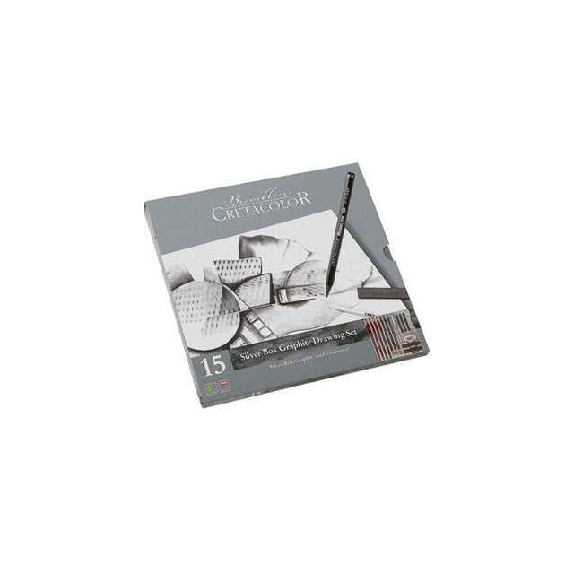 CRETACOLOR SILVER BOX - GRAPHITE TIN SET. An excellent set of Graphite drawing materials ideal for all sketching requirements.The Silver Box contains 3 square graphite blocks (2B, 4B, 6B), 3 Monolith woodless graphite pencils (2B, 6B, 9B), 2 water-soluble graphite pencils (HB, 8B), 4 'Cleos' Fine Art graphite pencils (2H, 2B, HB, 4B), 2 rectangular graphite sticks (4B, 6B), Monolith kneadable eraser and metal pencil sharpener. |