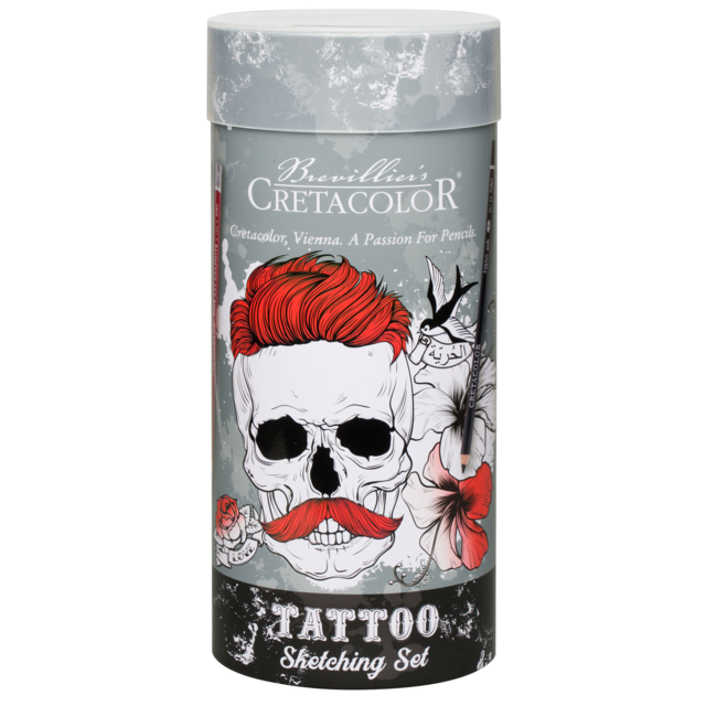 CRETACOLOR TATTOO SKETCHING SET. A specially selected set of products for sketching tattoo motifs on paper. Set contains one Cleos Fine Art Graphite Pencil each in HB, B and 9B, one Nero Pencils each in extra soft, soft, medium and hard, Graphite copy pencil, one twin- tip pencil in non-photo blue/Nero medium, one Molotow Permanent Balck Fineliner in 0.1 and 0.5mm, a vermillion Molotow Aqua Color Brush and Molotow Ultra clean eraser. |