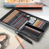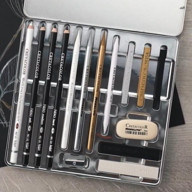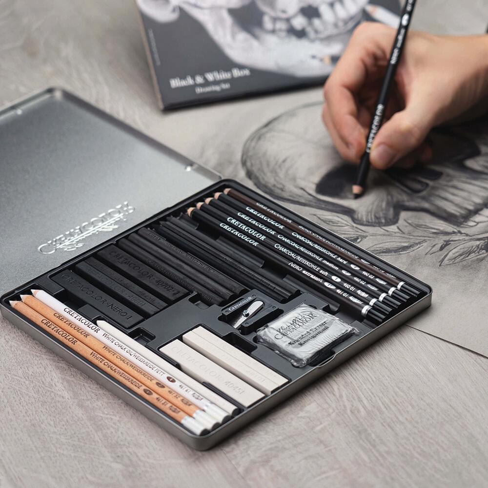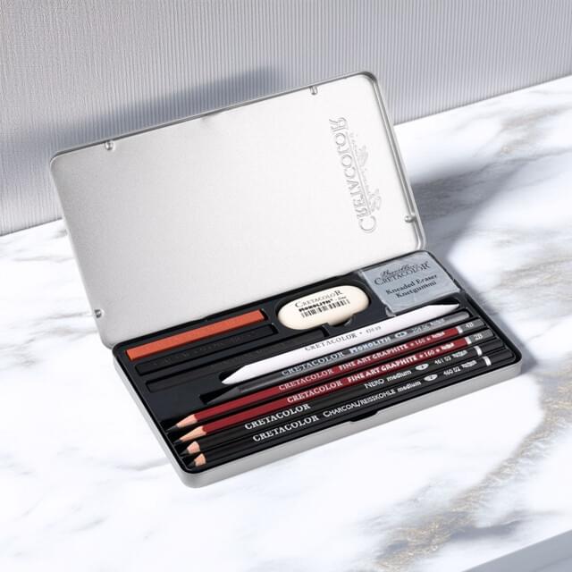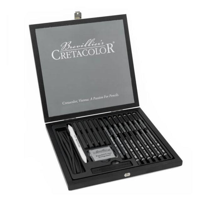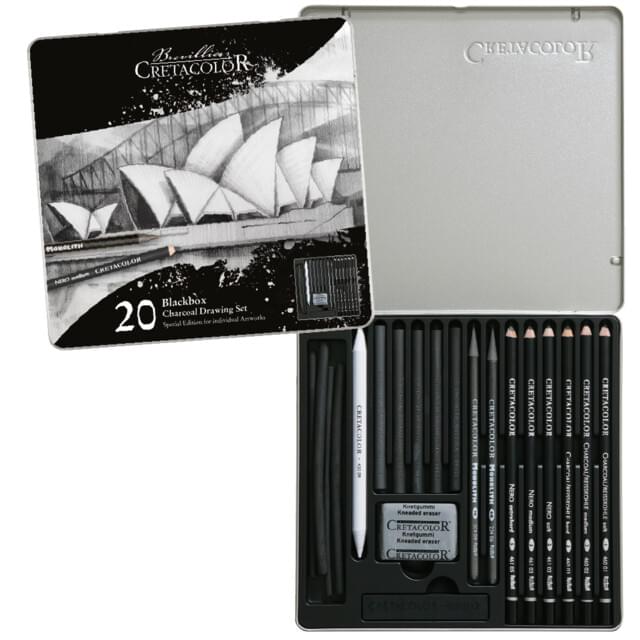 CRETACOLOR STANDARD DRAWING MATERIALS BLACK BOX -TIN 20. A 20 piece Charcoal and Graphite Drawing set. Contents: Charcoal Pencils soft/medium/hard, Nero Pencils soft/medium/hard, Monolith Graphite Pencils 6B & 9B, Compressed Charcoal Sticks soft/medium/hard, Natural Charcoal sticks 4 mm & 6 mm, Sketching Charcoal block 7x14x65mm a paper stump and kneadable eraser. |