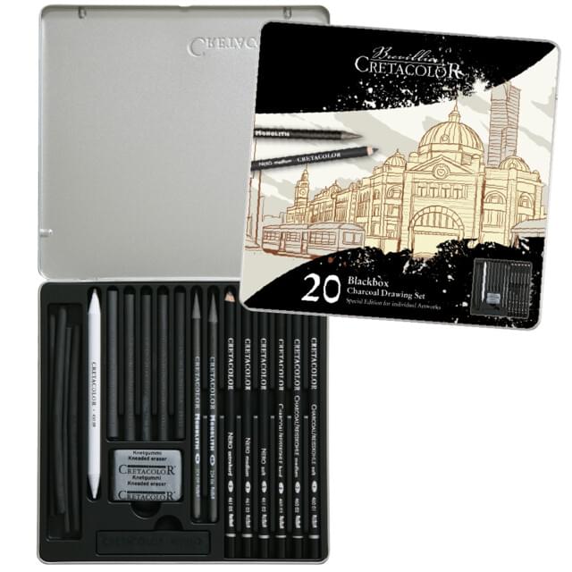 #CRETACOLOR FLINDERS STREET BLACK BOX DRAWING SET A beautifully presented tinned set featuring a view of the iconic Flinders Street Station facade on the hinged lid of the re-usable storage tin. Contents: Charcoal Pencils soft/medium/hard, Nero Pencils soft/medium/hard, Monolith Woodless Graphite Pencils 6B & 9B, Compressed Charcoal Sticks soft/medium/hard, Natural Charcoal sticks 4 mm & 6 mm, Sketching Charcoal block 7x14x65mm a paper stump and kneadable eraser. |