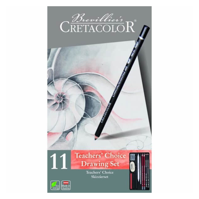 CRETACOLOR TEACHERS CHOICE BEGINNER SET. Contains the choice of basic sketching materials required by every student and includes one each of: medium charcoal and Nero carbon pencils, 2B, 4B 'Cleos' fine art graphite pencils, 6B Monolith woodless pencil, soft compressed charcoal stick, black and sanguine pastels plus a large kneadable eraser, paper stump and Monolith India rubber erasers. |