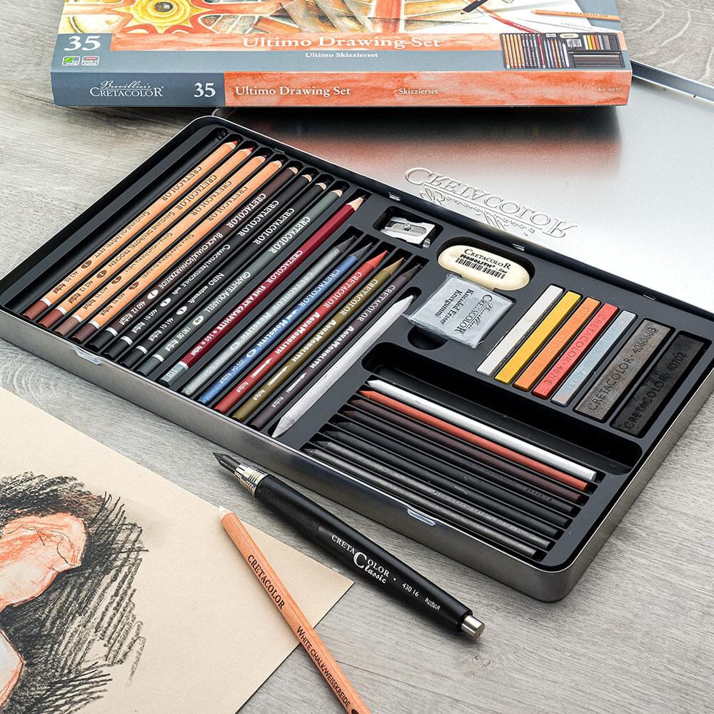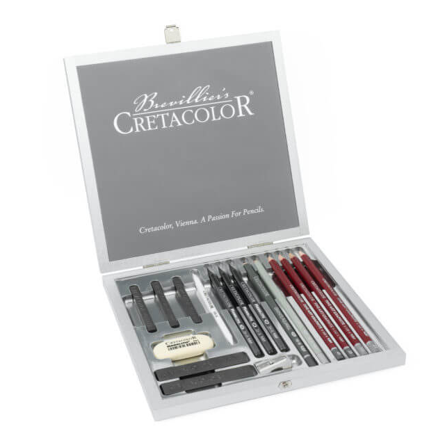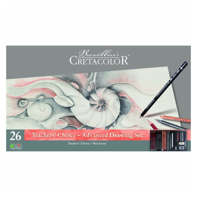 CRETACOLOR TEACHERS CHOICE ADVANCED DRAWING SET. Contains 2H, HB, 2B and 4B Cleos pencils, one each sanguine, sepia light, sepia dark and white, chalk pencils soft and medium, charcoal pencils soft and hard, carbon pencils 4B and 8B, watersoluble graphite pencils soft and medium, compressed charcoal sticks, 6B woodless pencil, one stick each sketching coal thick, 6B graphite thin, 2B graphite sanguine burnt. |