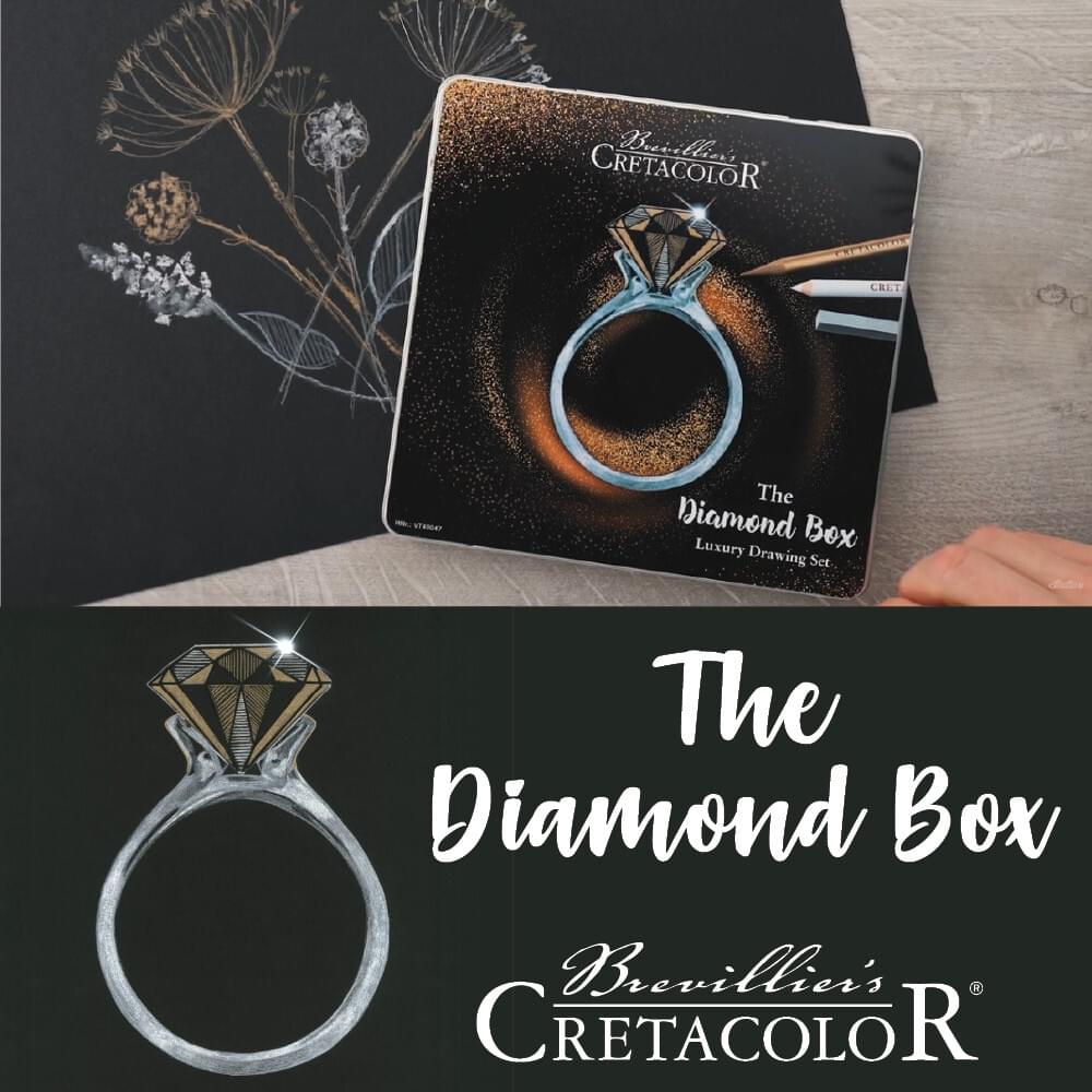 CRETACOLOR DIAMOND 15 PIECE DRAWING LUXURY METAL BOX SET Luxury drawing set that includes highly pigmented gold and silver colouring media for producing breath-taking metallic effects, deep black accents and white highlights on dark backgrounds. Contains one each of silver, gold and deep black carre pastel, white chalk oil pencil, one Nero pencil each in soft, medium and hard, one Monolith pencil each in white, gold and silver, one art stick each in white chalk dry and Nero extra-soft, paper stump, eraser and sharpener. |