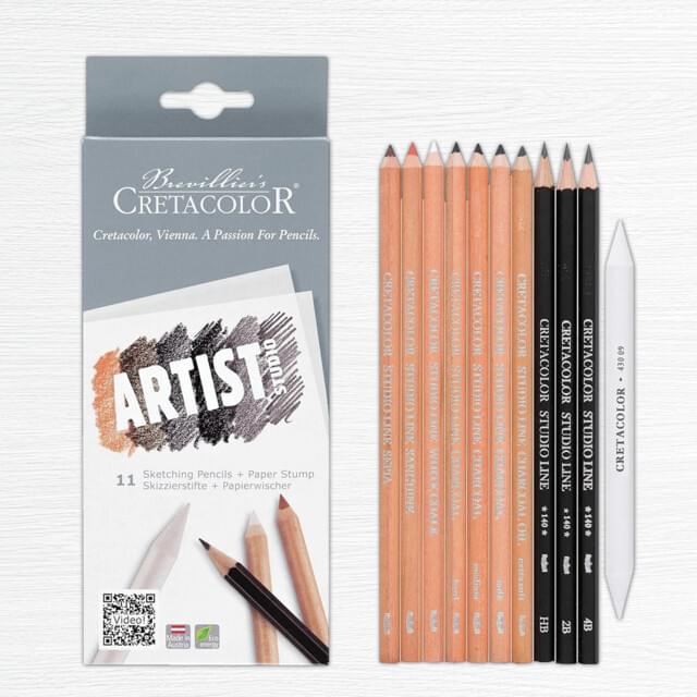 CRETACOLOR ARTIST STUDIO MIXED MEDIA '101' SKETCHING SET. An excellent value, introductory drawing set containing a selection of graphite, charcoal, chalk and oil pencils. This boxed assortment contains 3 graphite pencils (HB, 2B, 4B), an extra soft oil charcoal pencil, white chalk pencil, sanguine pencil, sepia pencil, 3 charcoal pencils (soft, medium, hard)plus paper blending stump. |
