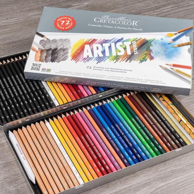 CRETACOLOR STUDIO 72 PENCIL SKETCHING & DRAWING SET.This comperhesive set contains 12 Artist Studio graphite pencils (6B, 4B, 3B, 2B, B, 2 x HB, F, H, 2H, 3H & 4H), 7 Artist Studio sketching pencils (sepia, sanguine, white pastel, charcoal pencils extra-soft, soft, medium & hard), 24 Artist Studio permanent colour pencils, 24 water-soluble colouring pencils, Cretacolor colouring pencils in gold and silver, 2 quatro (4 colour colour strip) pencils and 1 paper stump in a re-usable metal storage tin. |