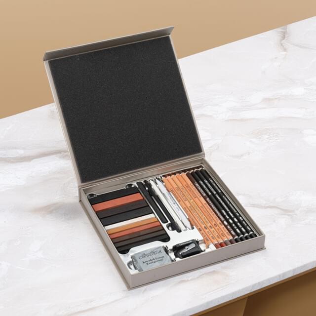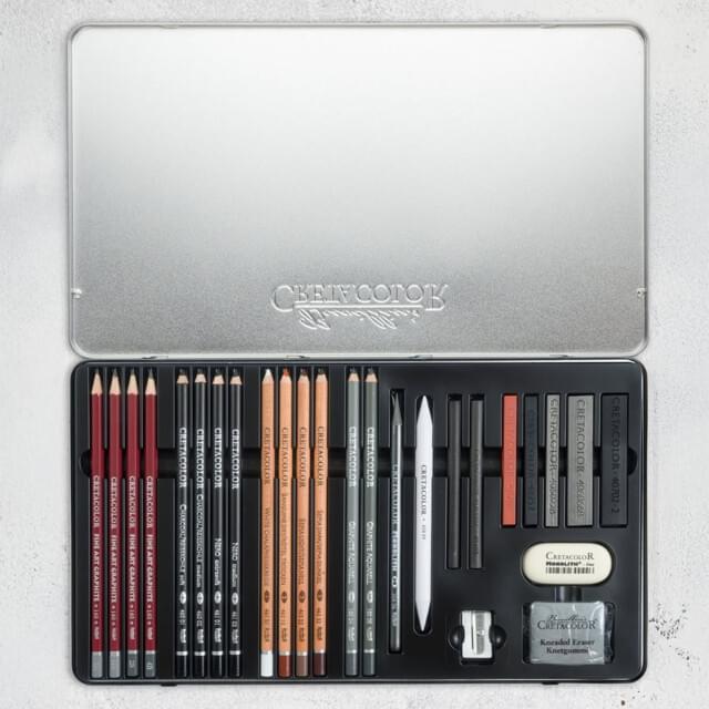 CRETACOLOR CREATIVO SKETCHING & DRAWING TIN SET. A versatile and high value starter set suitable for amateur to professionals. Contains twelve pastels in brown shades, one each Graphit Aquarelle pencils (HB, 4B, 6B), one each Nero Medium Pencil, one each Charcoal Pencil No. 2 (Medium), one each Soft and Medium White Chalk Pencil, one each Sepia Dark Pencil, one each Sepia Light Pencil, one each Sanguine Dry Pencil, one each Sanguine Oil Pencil, one each Black Chalk Pencil |