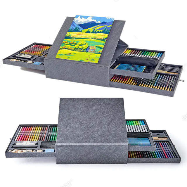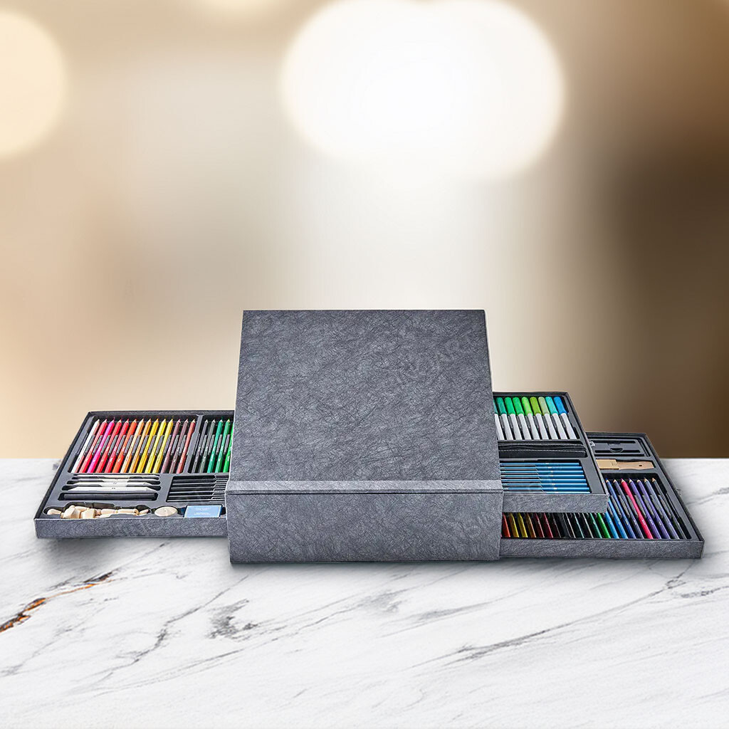 SINOART 140 PIECE DELUXE MIXED MEDIA DRAWING GIFT SET. Contains all the basic mixed media supplies a beginning artist requires in a compact easel and 3 drawer fibre storage boxes. Materials included as follows: 36 watercolour marker pens, 28 colouring pencils, 28 watercolour pencils, 8 graphite sketching pencils, 6 charcoal pencils, zipped pencil storage case, 5 willow charcoal sticks, 12 soft pastels, 3 compressed charcoal sticks, 2 graphite sticks, set of 4 paper stumps, wooden artists manikin plus 1 each sandpaper block, metal pencil sharpener, kneadable eraser, vinyl eraser and a quality watercolour paper pad all packed in a 3 drawer easel/storage case. |