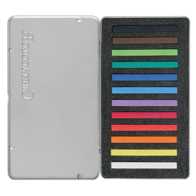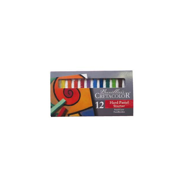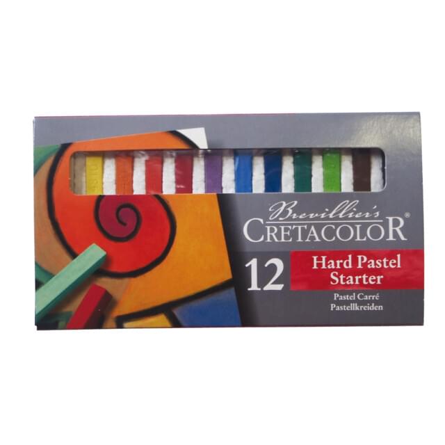 CRETACOLOR PASTEL STARTER SET - 12 ASSORTED COLOURS INCLUDING permanent white, cadmium citron, orange, vermilion dark, carmine extra fine, bluish purple, light blue, prussian blue, leaf green, pea green, van dyk brown and ivory black. |