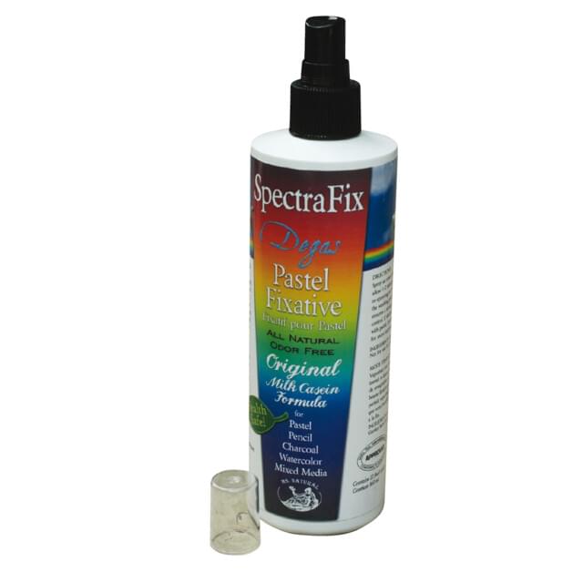 SpectraFix is formulated from a blend of art-grade natural milk casein, water and pure grain alcohol to produce a colourless, rapid drying, water-resistant and non-yellowing film. The alcohol evaporates rapidly taking the water with it leaving only a thin layer of casein which dries quickly to a protective and archival acid free matte film. Also protects fragile pastels without colour change!