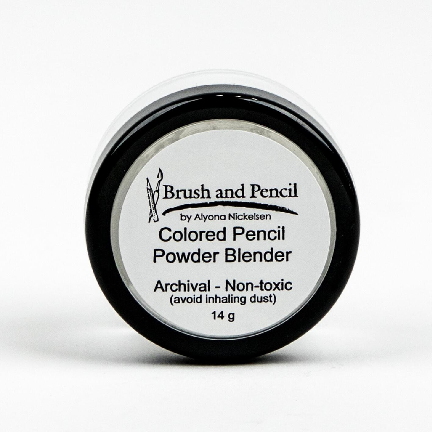 BRUSH'N PENCIL COLOUR PENCIL POWDER BLENDER. Coloured Pencil Powder Blender (14g jar with sifter)This unique non-toxic, archival, dry lubricant for the coloured pencil medium allows the artist to blend colours without the use of solvents.The product works remarkably well on rigid, toothy surfaces, such as sanded papers or toothy gessoes.Performs best with oil-based coloured pencils however it can be used with wax-based pencils after pre-treating the surface for subsequent pencil application.Apply with sponges or short bristle brushes.Powder Blender makes the coloured pencil medium completely adjustable, correctible and erasable.Fix and secure the powder application with ACP Final or Textured Fixative. |