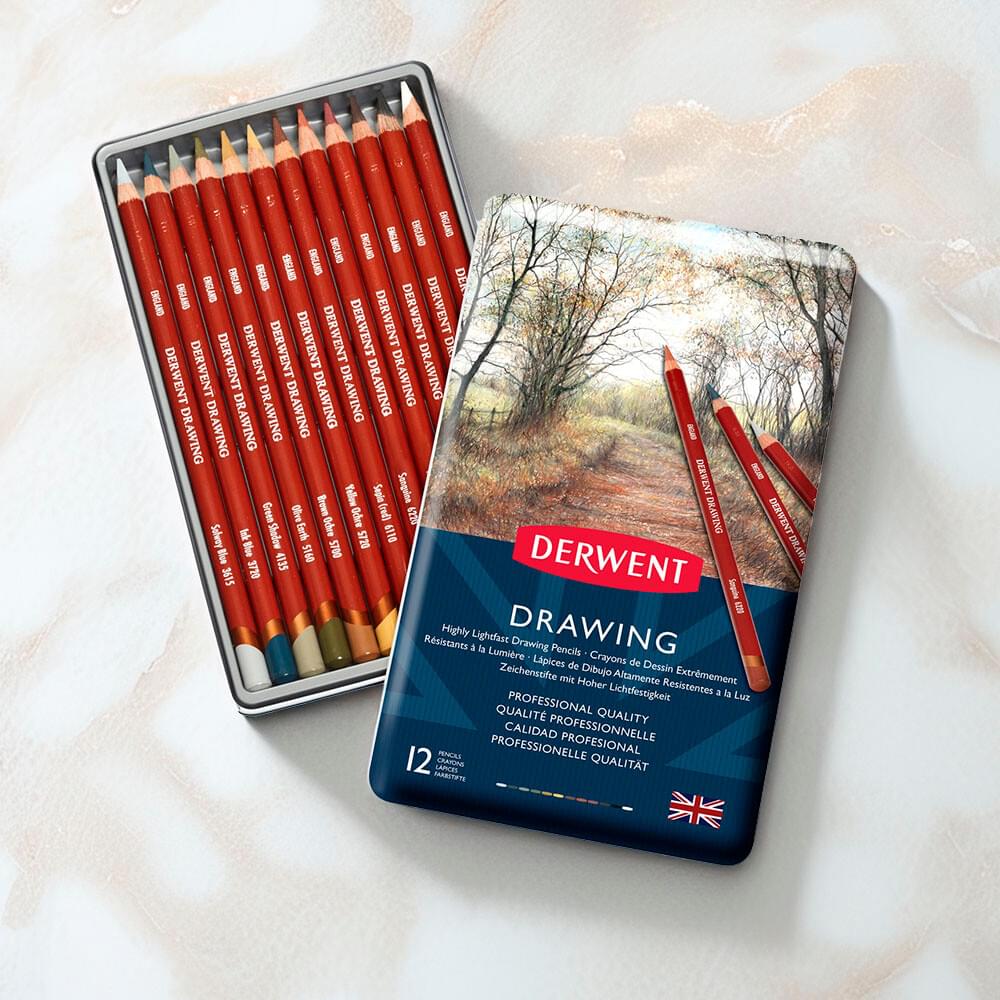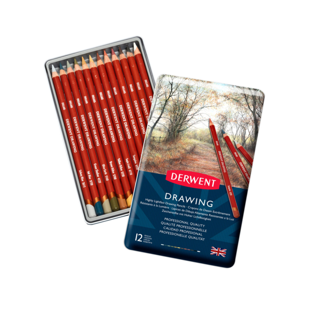 DERWENT DRAWING PENCIL SET - 12 ASSORTED COLOURS INCLUDING chinese white, ivory black, chocolate, ruby earth, sanguine, sepia (red), yellow ochre, brown ochre, olive earth, green shadow, ink blue, solway blue. |
