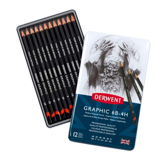 DERWENT GRAPHIC DESIGNER GRAPHITE PENCIL TIN OF 12. Designer set contains one pencil each in the grades 6B - 4H. |
