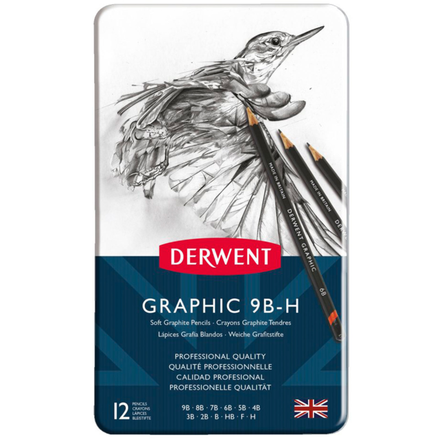 DERWENT GRAPHIC SKETCHING GRAPHITE PENCIL TIN OF 12. Sketching set contains one pencil each in the grades 9B - H. |