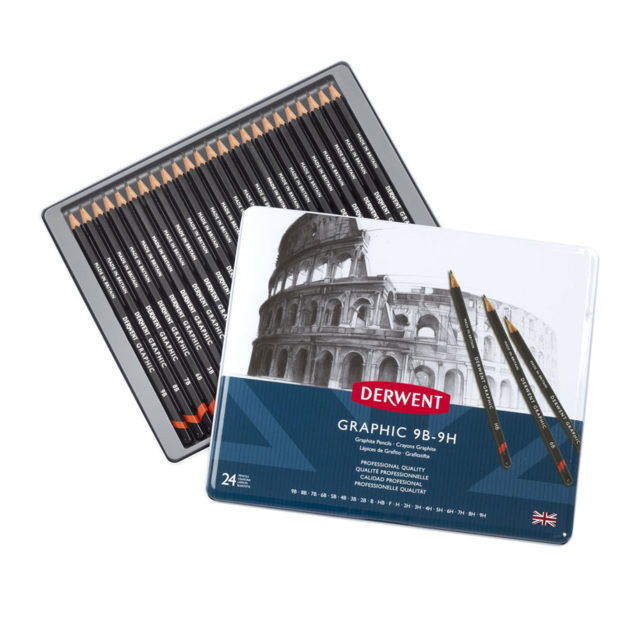#DERWENT GRAPHIC GRAPHITE PENCIL-TIN SET 24. Contains one each of the grades 9B-4H plus 1 extra pencil in the four most popular grades |
